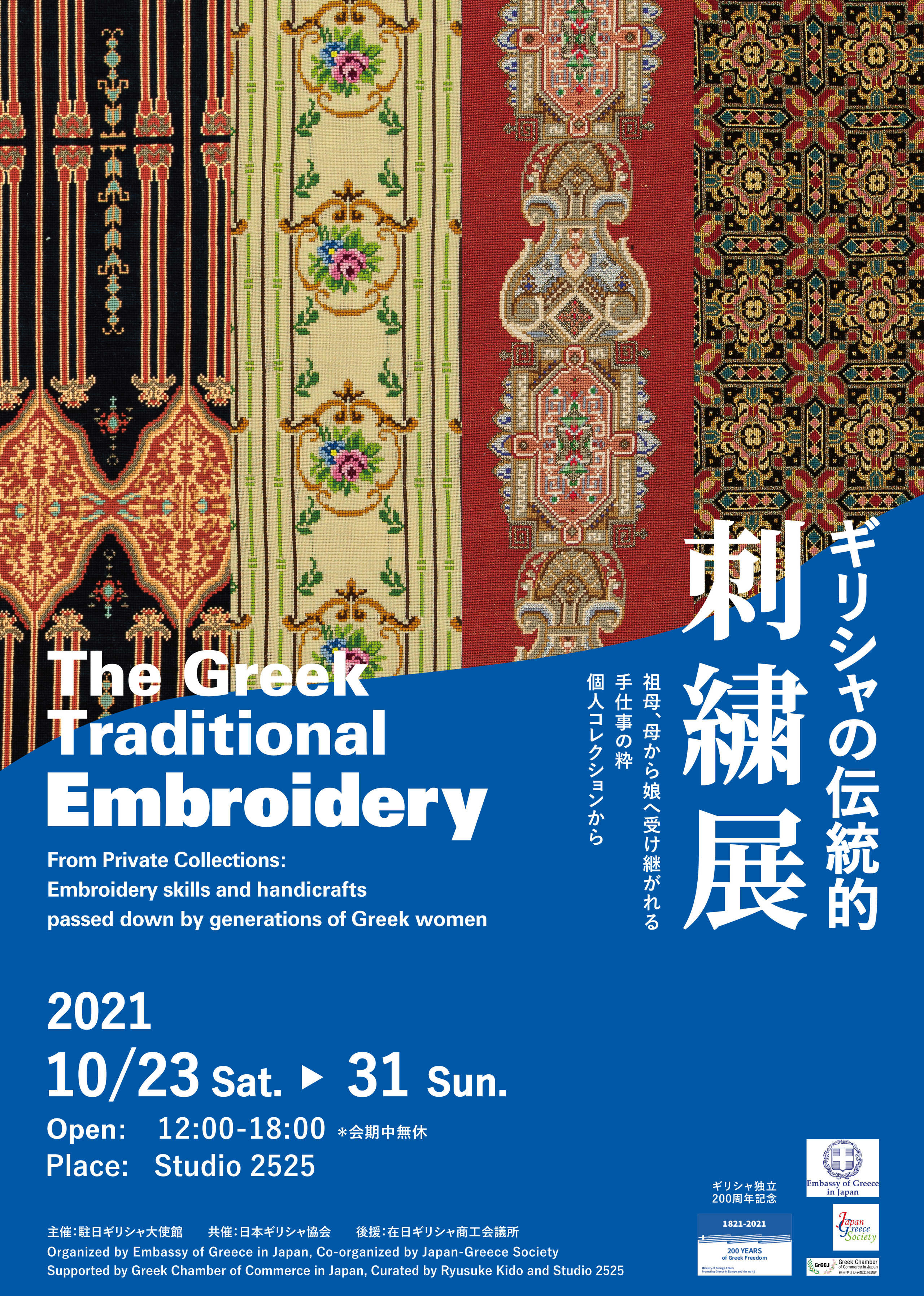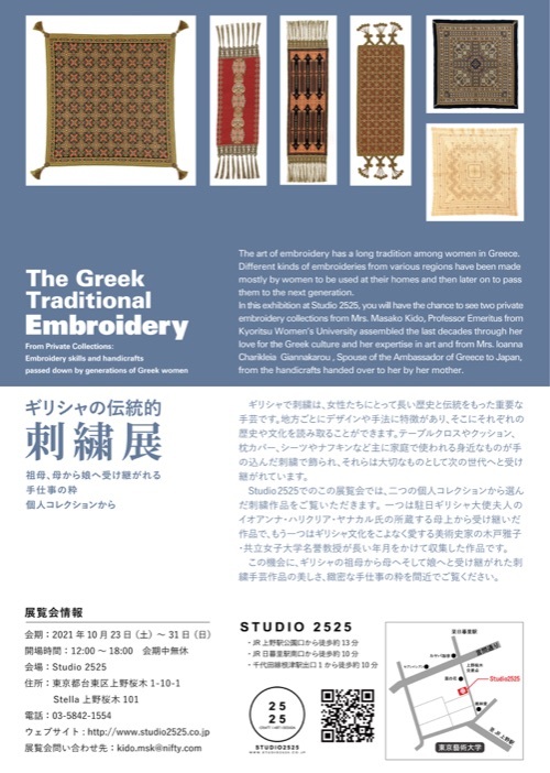 Different kinds of embroideries from various regions have been made mostly by women to be used at their homes and then later on to pass them to the next generation. In this exhibition at Studio 2525, you will have the chance to see two private embroidery collections from Mrs. Masako Kido, Professor Emeritus from Kyoritsu Women’s University assembled the last decades through her love for the Greek culture and her expertise in art and from Mrs. Ioanna Charikleia Giannakarou , Spouse of the Ambassador of Greece to Japan, from the handicrafts handed over to her by her mother.